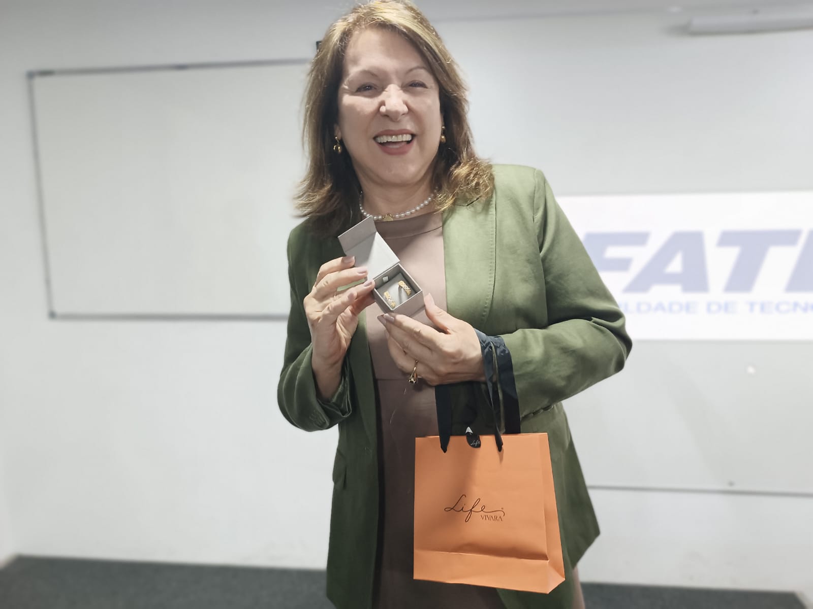 Profa. Dra. Lucia Alves Lara recebe presente das alunas médicas ginecologistas, agora, sexologistas
