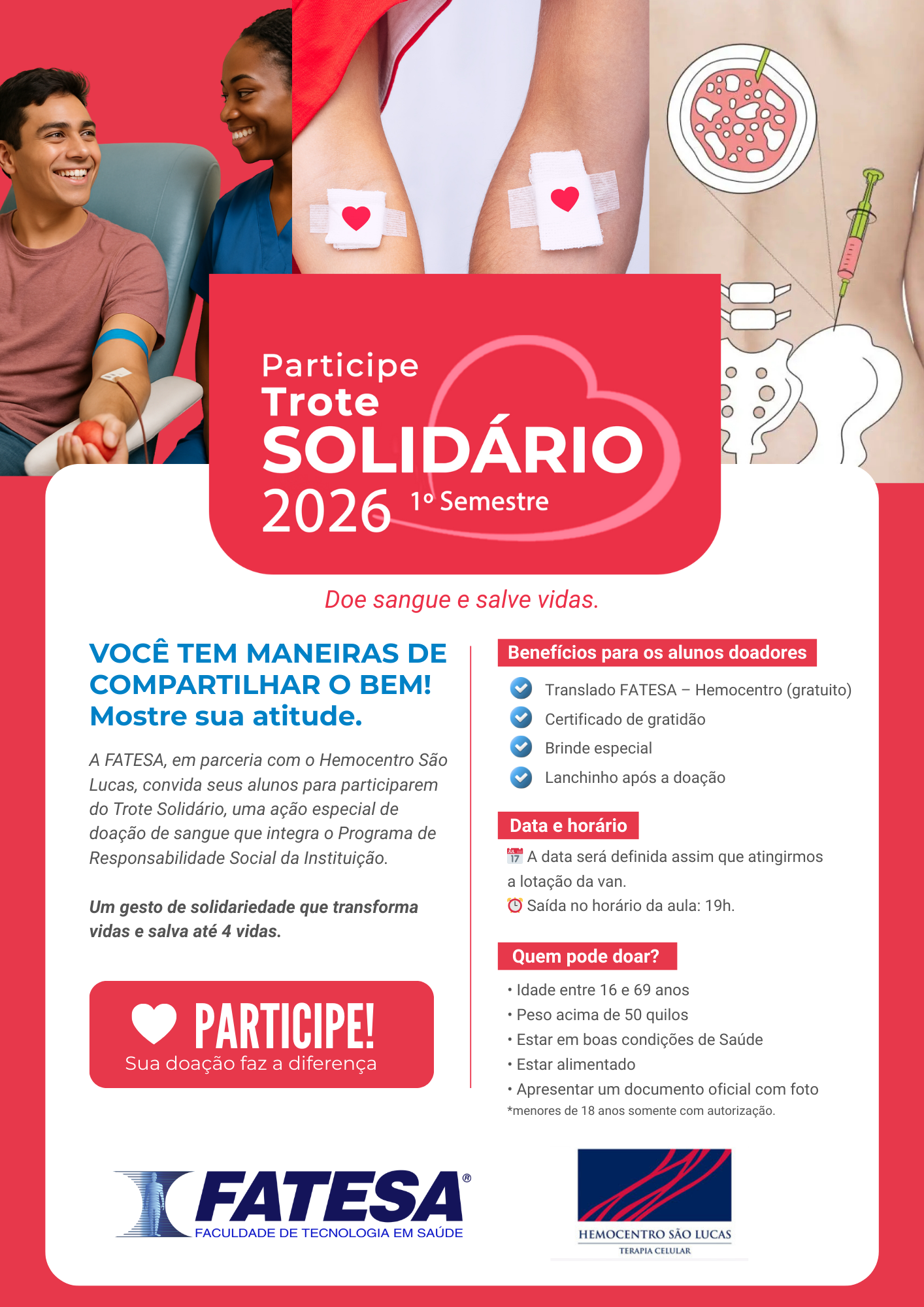 "Nossa missão na FATESA sempre foi unir a excelência técnica ao lado humano. O Trote Solidário é a nossa forma de dar as boas-vindas aos alunos mostrando que a saúde começa com a solidariedade. Ao promover essa parceria com o Hemocentro, queremos que nossos estudantes sintam, desde o primeiro dia, o impacto positivo que podem causar na sociedade."
