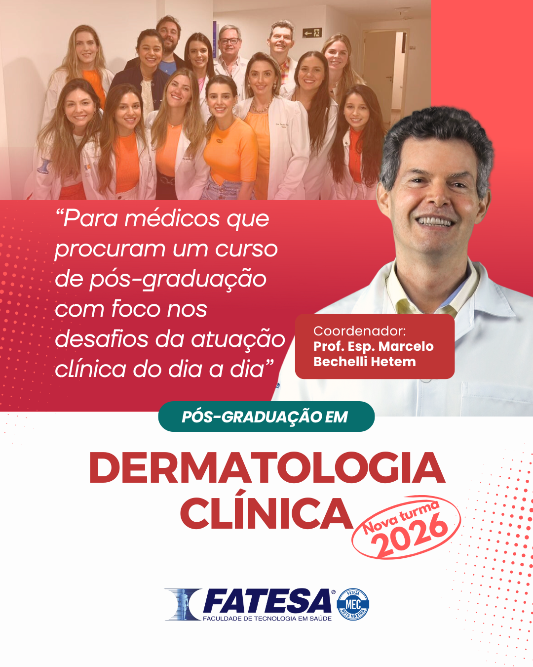 Estão abertas as inscrições para a prestigiada Pós-Graduação em Dermatologia Clínica da FATESA, sob a coordenação do renomado Prof. Esp. Marcelo Bechelli Hetem. Com início confirmado para 28 de março de 2026, esta edição marca a 13ª turma do curso, consolidando uma trajetória de sucesso na formação de médicos altamente capacitados para o mercado.