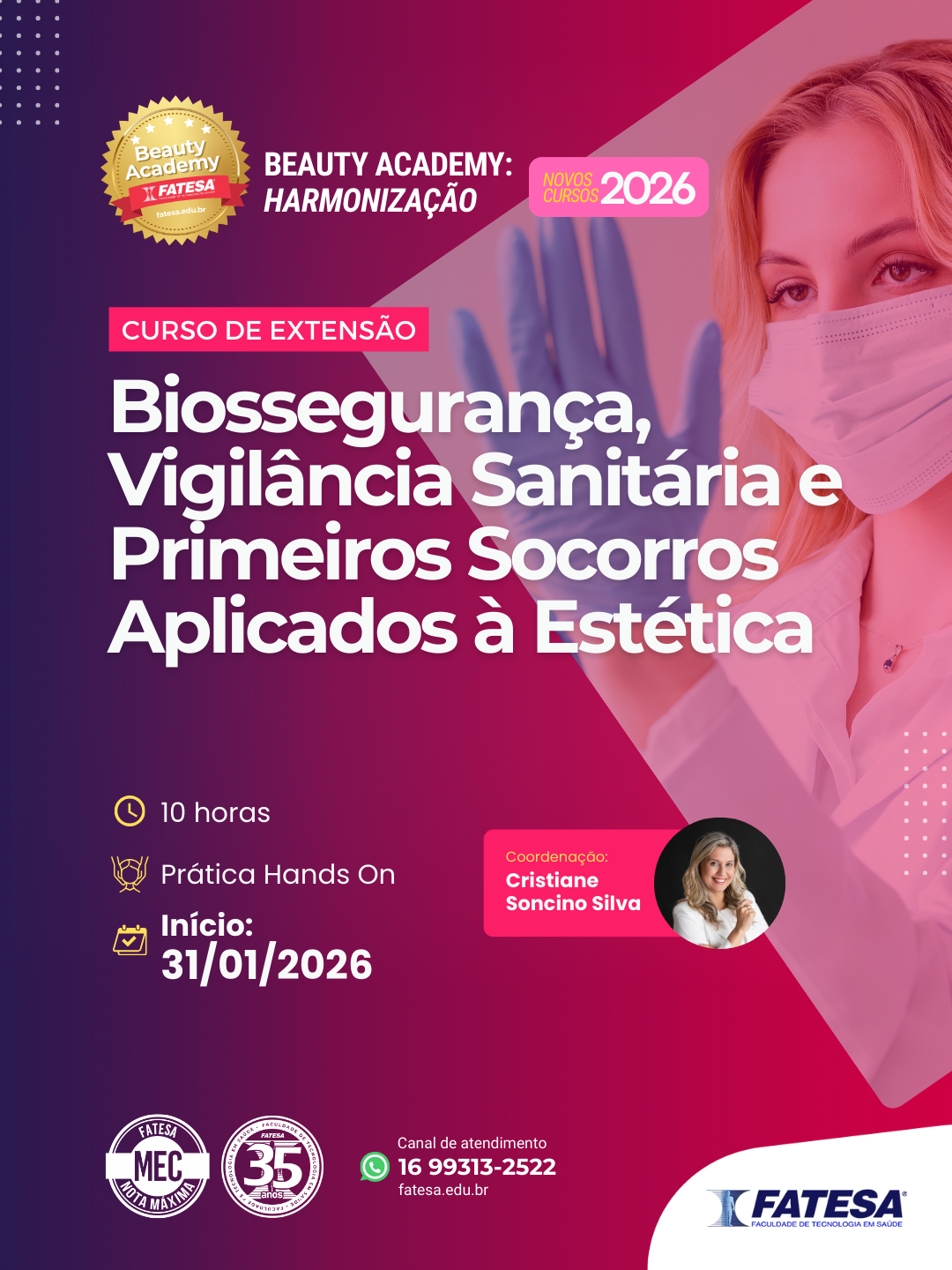 Pensando nisso, a FATESA (Faculdade de Tecnologia em Saúde), instituição com 35 anos de tradição e nota máxima no MEC, promove, no dia 31 de janeiro, o curso de extensão: “Biossegurança, Vigilância Sanitária e Primeiros Socorros Aplicados à Estética”.