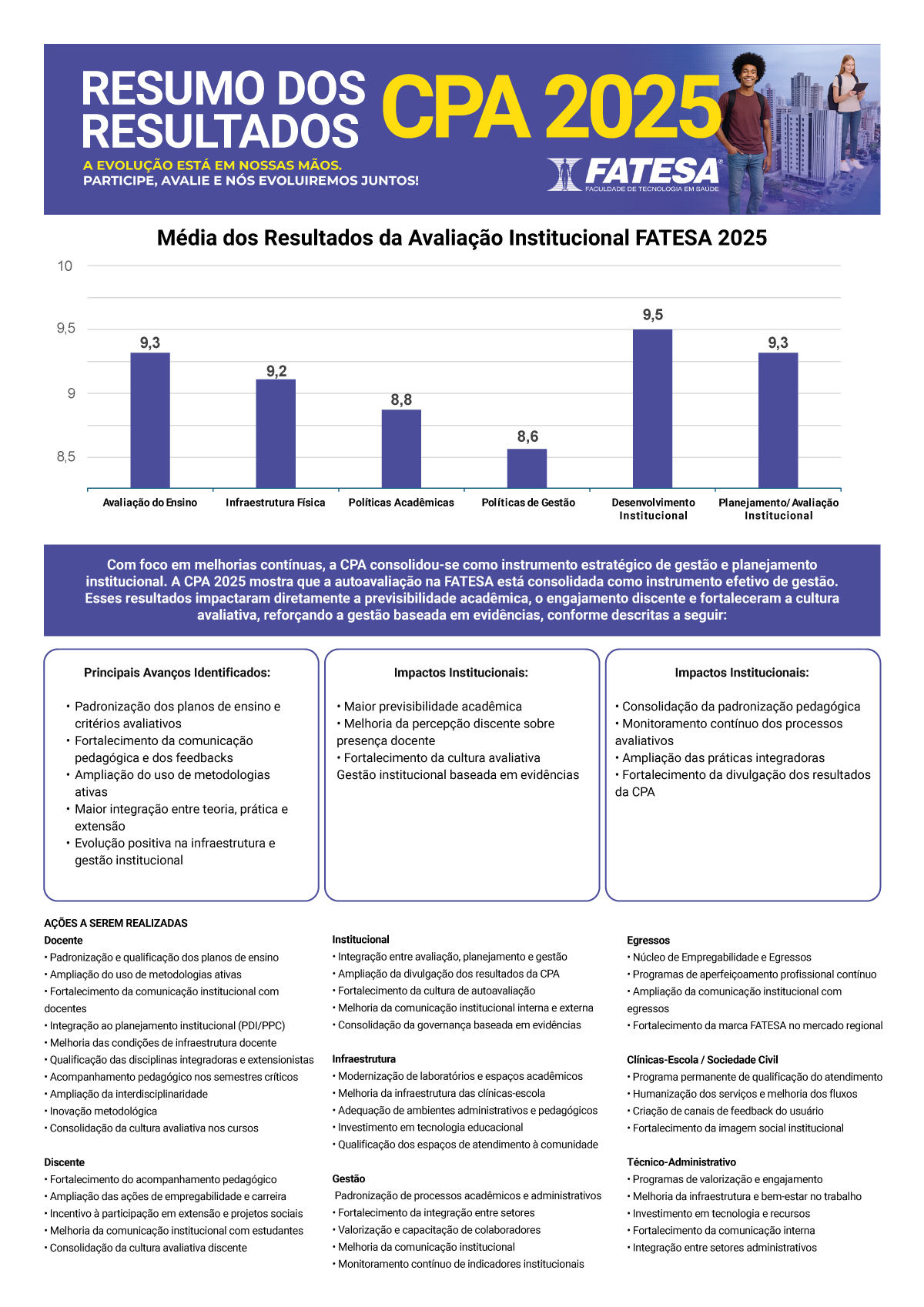 A seguir, apresentamos, de forma visual e organizada, os principais dados consolidados da Avaliação Institucional da FATESA, com os resultados atuais e das edições anteriores. Esse material evidencia os avanços institucionais ao longo do tempo e reforça nosso compromisso contínuo com a qualidade, a inovação e a responsabilidade social. |