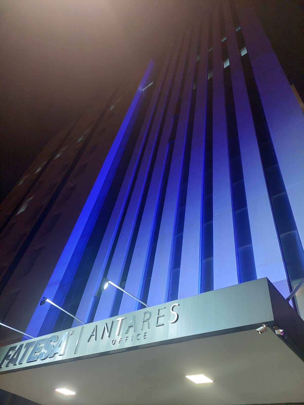 A fachada iluminada da FATESA é um símbolo de que a vida deve ser prioridade. Não ignore os sinais do seu corpo e converse abertamente com um profissional de saúde.